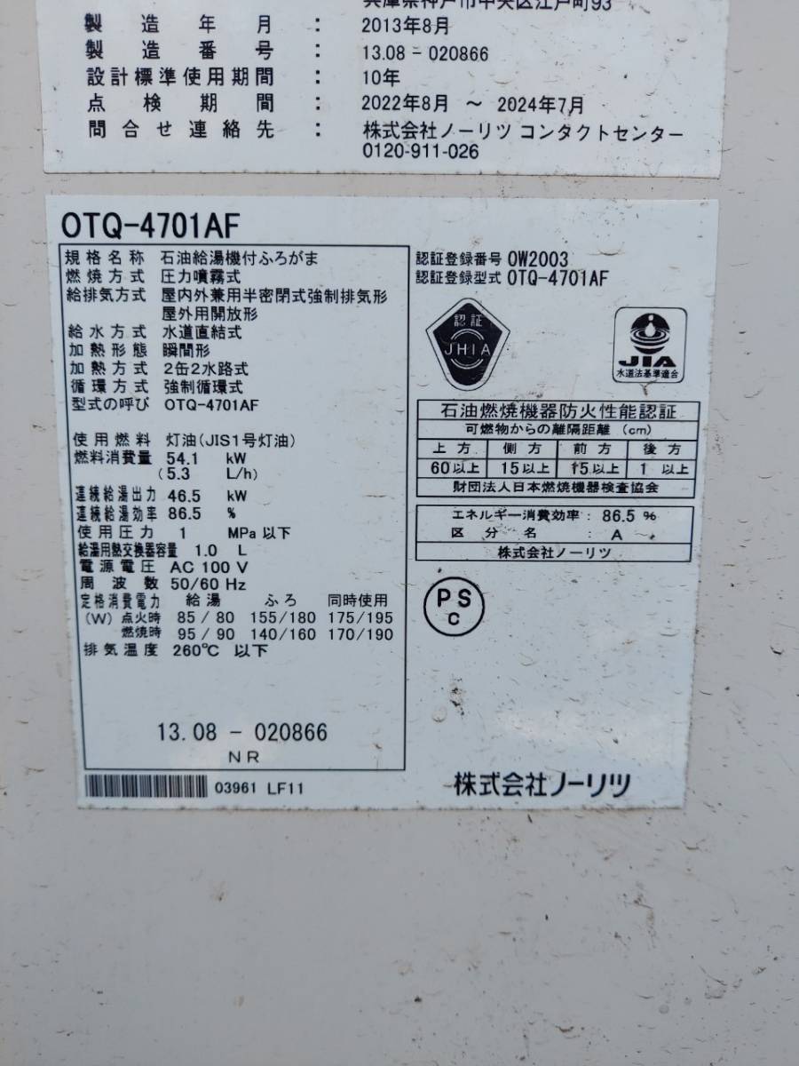 川本町 ノーリツOTQ-4701AF→ノーリツ給湯器 給湯器交換工事