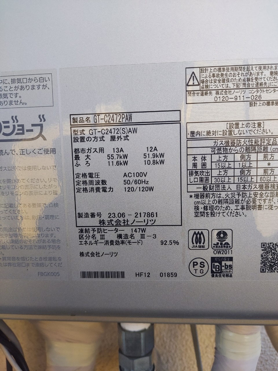 施工事例:津和野町 ノーリツ給湯器GT-C2472PAW 給湯器交換工事