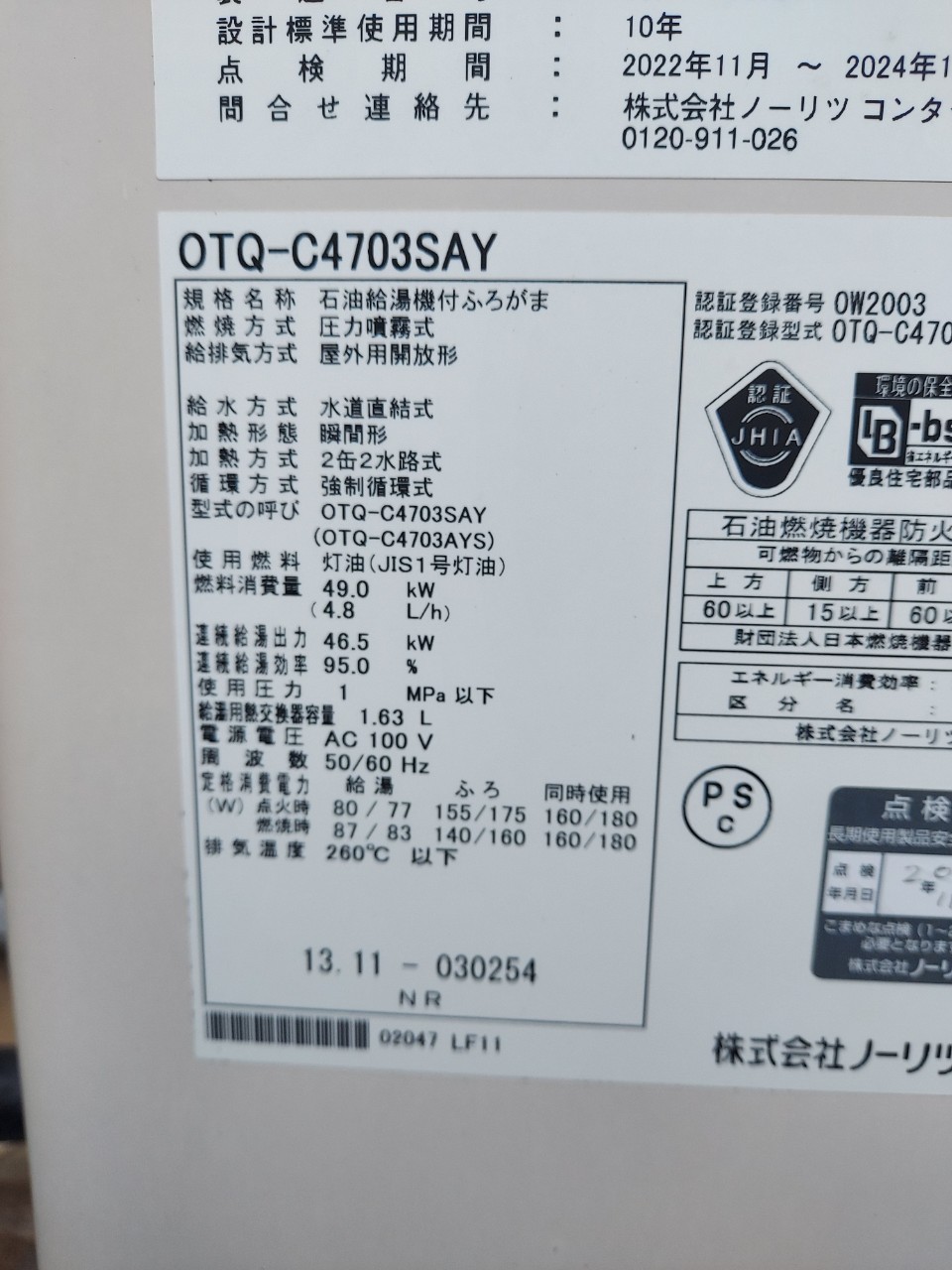 海士町 ノーリツ給湯器OTQ-C4703SAY→ノーリツ石油給湯機付ふろがまOTQ-C4706SAY 給湯器交換工事